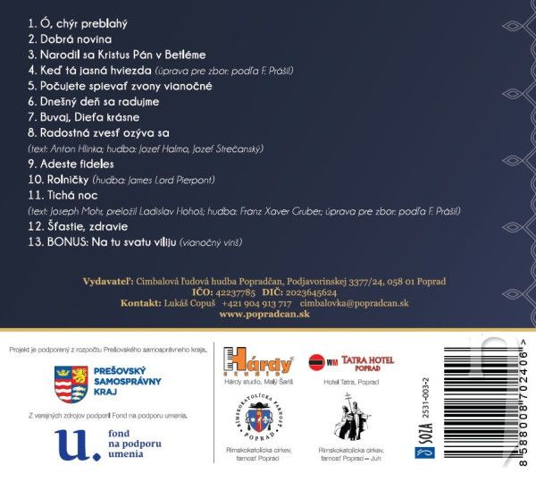 Vianočné CD Cimbalovky Popradčan je zavŕšením koncertnej spolupráce so speváckym zborom pri Konkatedrále Sedembolestnej Panny Márie v Poprade a môžete na ňom nájsť výber známych vianočných kolied v zaujímavých úpravách pre cimbalovku a spevácky zbor.