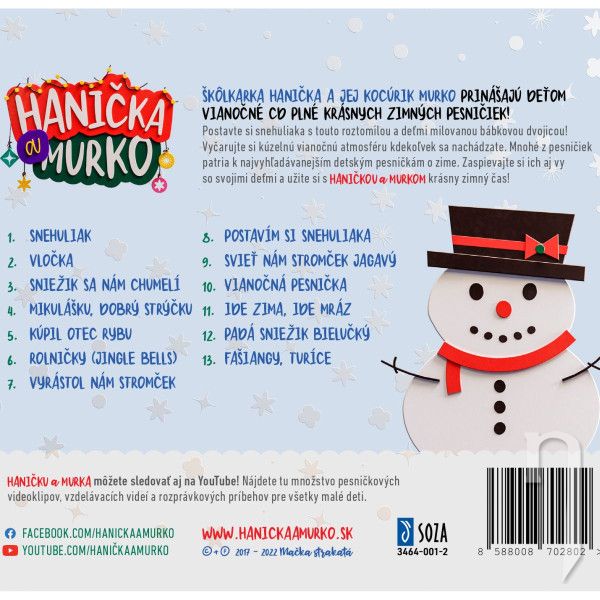 Škôlkarka Hanička a jej kocúrik Murko prinášajú deťom VIANOČNÉ CD plné krásnych zimných pesničiek! Postavte si snehuliaka s touto roztomilou a deťmi milovanou bábkovou dvojicou! Vyčarujte si kúzelnú vianočnú atmosféru kdekoľvek sa nachádzate. Mnohé z 13 pesničiek na CD patria tradične k najvyhľadávanejším detským pesničkám o zime, Vianociach či Mikulášovi, ale nájdete tu aj nové skladby priamo z dielne Haničky a Murka. Zaspievajte si ich aj vy so svojimi deťmi a užite si s Haničkou a Murkom krásny zimný čas!