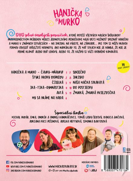 Populárne bábky - speváčka Hanička a jej kocúrik Murko - prinášajú škôlkarom DVD plné veselých pesničiek! Nájdete na ňom klipy k pesničkám z ich úspešného CD Pesničky pre škôlkarov - zhudobnené riekanky, nanovo zaranžované obľúbené ľudové piesne a tiež úplne nové pesničky tejto milej dvojice. Prostredníctvom príbehov medzi jednotlivými pesničkami majú deti možnosť spoznať Haničku a Murka v dobre známych situáciách - na ihrisku, na výlete, v záhrade… Pri tom si môžu hravou formou osvojiť dôležité hodnoty, ako napr. to, že mať strach nie je hanba, že nie je pekné klamať alebo byť lenivý, alebo to, že každý si váži dobrého kamaráta. Každodennými dobrodružstvami sprevádzajú Haničku a Murka aj ich kamaráti - známe osobnosti herec Michal Hudák, hudobnícka rodinka Kandráčovcov, herečka Danica Jurčová, spevák Lasky, speváčka Paci, či Adelka Heftyová, detská hviezda seriálu Prázdniny.