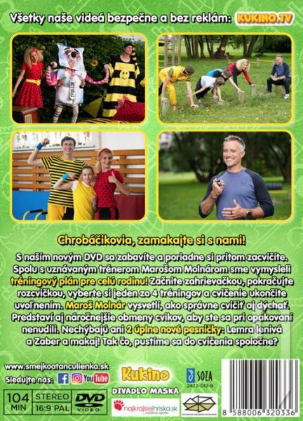 Chrobáčikovia, zamakajte si s nami! S naším novým DVD sa nielen zabavíte, ale takisto si poriadne zacvičíte. Spolu s uznávaným trénerom Marošom Molnárom sme vymysleli tréningový plán pre celú rodinu. Začnite zahrievačkou, pokračujte rozcvičkou, vyberte si jeden zo štyroch tréningov a nakoniec ukončite cvičenie uvoľňovacími cvikmi. Maroš Molnár vám vysvetlí, ako správne cvičiť aj dýchať. Dokonca predstaví aj náročnejšie obmeny cvikov, takže opakované cvičenie bude rovnako zábavné. Samozrejme, nebudú chýbať ani dve úplne nové pesničky: Lemra lenivá a Zaber a makaj! Tak čo, pustíme sa do cvičenia spoločne?