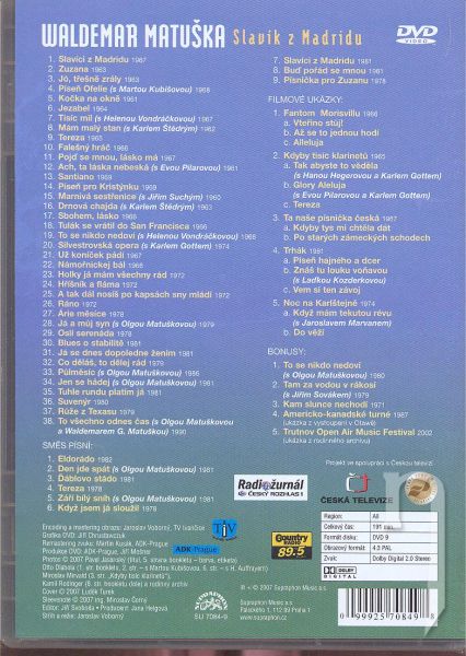 DVD obsahuje 38 piesní Waldemara Matušku, filmové ukážky z fantoma Morisvillu, Kdyby tisíc klarinetu, ta naše písnička česká, Trháku a Noc na karlsteine